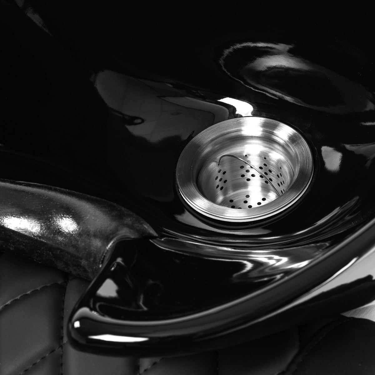 Das tiefe Keramikwaschbecken in Schwarz ist nicht nur elegant, sondern auch äußerst praktisch. Es verhindert Spritzer und ermöglicht ein komfortables und effizientes Arbeiten. Die Keramik ist robust, kratzfest, leicht zu reinigen und resistent gegen Verfärbungen. Der speziell geformte Rand und die geneigte Rückenlehne bieten zusätzlichen Komfort und Halt während der Haarwäsche. Eine weiche Auflage aus Kunststoff sorgt dafür, dass Ihre Kunden die kühle Keramik nicht direkt spüren.